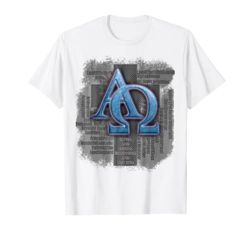 - Featuring a Alpha and Omega logo in front of a subtle graphic of the Names and titles of Jesus. This design is perfect to wear to church, Bible Study or anywhere.