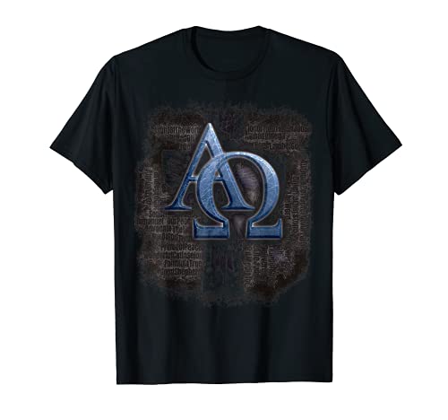 - Featuring a Alpha and Omega logo in front of a subtle, texture rich graphic of the Names and titles of Jesus. This shirt is perfect to wear to church, Bible Study or anywhere. Encourage the Forgiven by rocking this T-shirt