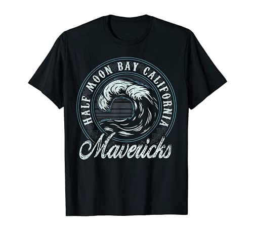 - Featuring the words HALF MOON BAY CALIFORNIA, MAVERICKS in a cool distressed vintage circular aesthetic with a big retro wave. The perfect gift for your surfer. Show them your inner surf legend by rocking this design.