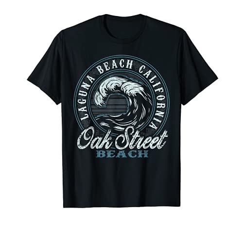 - Featuring the words LAGUNA BEACH CALIFORNIA, OAK STREET, BEACH in a cool distressed vintage circular aesthetic with a big retro wave. The perfect gift for your surfer. Show them your inner surf legend by rocking this design.