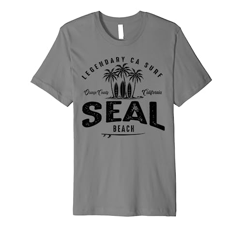 - Seal Beach - Embrace the nostalgia of vintage surf culture with this retro distressed surf design. Featuring palms trees, surfboards and distressed text, this design captures the essence of a bygone era. For seasoned surfer or a just beach lover