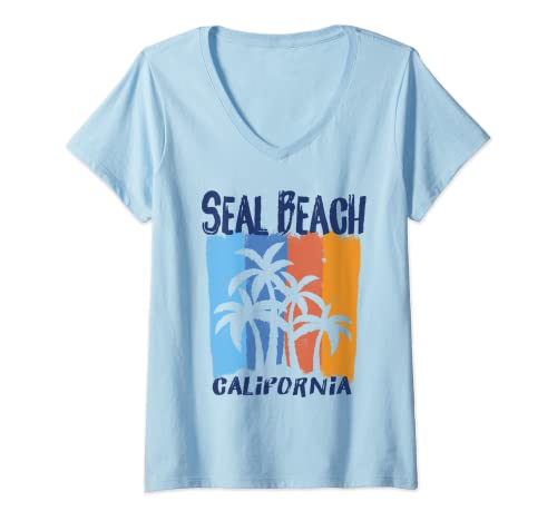 Womens Seal Beach California Fun Colorful Palm Trees Design V-Neck T-Shirt